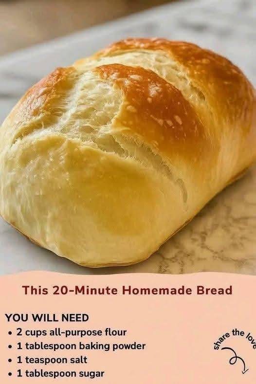 Sure! While most traditional breads need time to rise, here’s a quick 20-minute homemade bread that’s soft, fluffy, and perfect for when you need something fast. This isn’t a yeast-risen loaf, but rather a quick bread — more like a savory scone or biscuit loaf — and still totally satisfying.