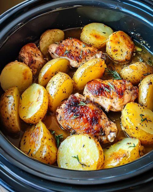 Bake 40–45 minutes, or until chicken reaches an internal temperature of 165°F (74°C) and potatoes are golden and tender.