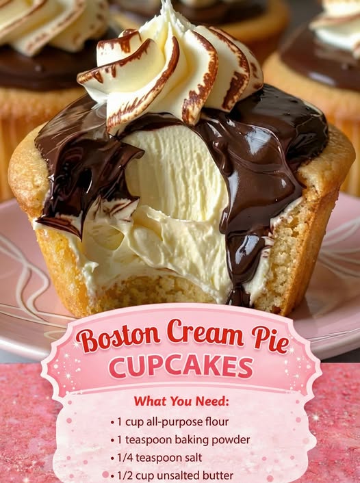 Oh yes 😍 Boston Cream Pie Cupcakes—all the flavor of the classic dessert in a single handheld treat: soft vanilla cupcakes, luscious custard filling, and a rich chocolate ganache on top. Here’s a full, foolproof recipe: