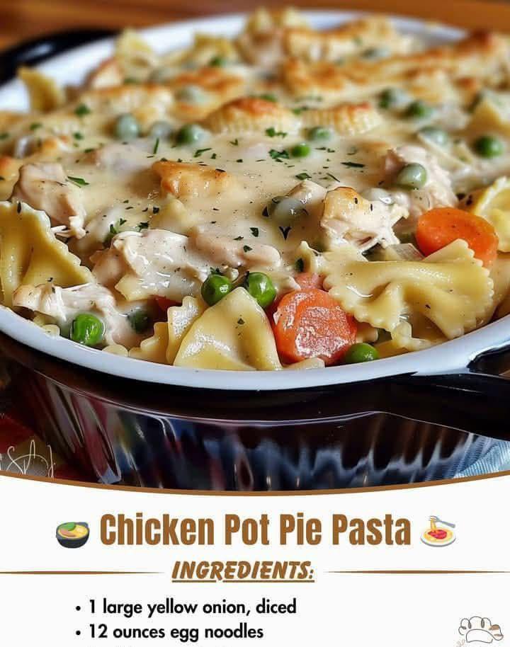 Ah yes — Chicken Pot Pie Pasta 🍗🥧🍝 — all the cozy, creamy flavors of chicken pot pie, but faster and easier because it’s served over pasta instead of in a pie crust. Here’s a comforting recipe perfect for dinner.