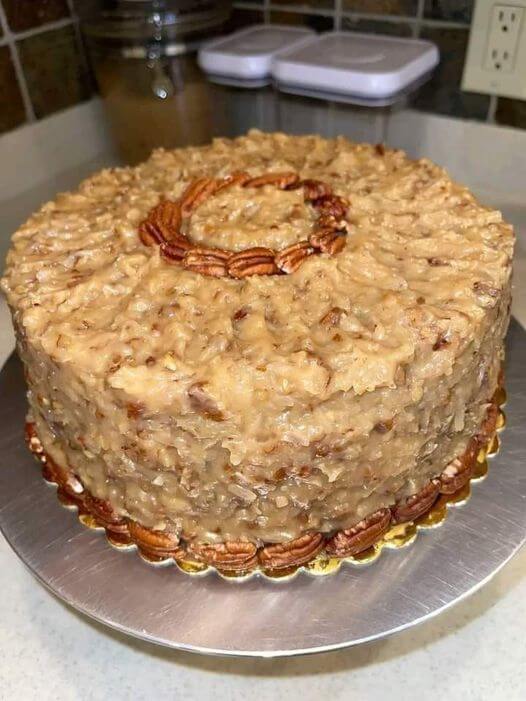 Traditionally, German Chocolate Cake is not frosted on the sides — just stacked with frosting in between and on top.