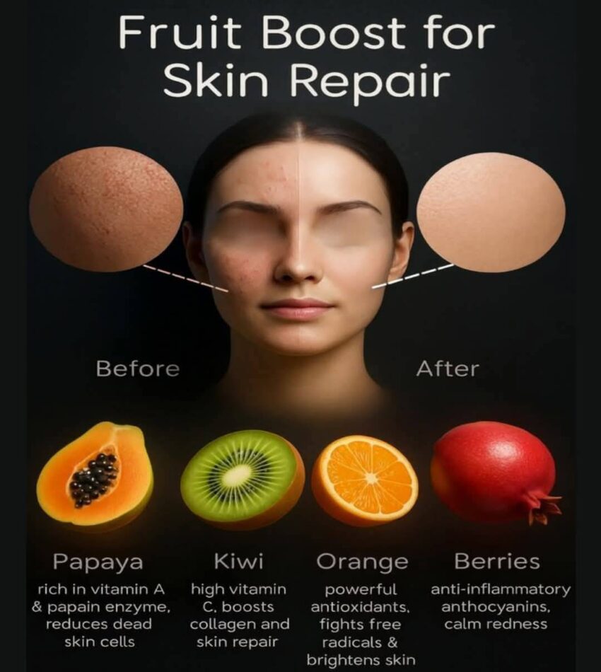 Fruit supports skin repair by providing nutrients, but it won’t instantly fix acne, scars, or aging. Consistency + overall habits matter most.