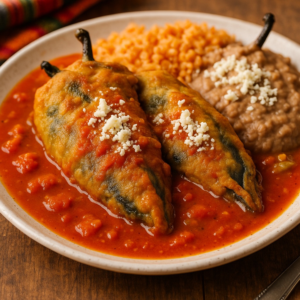 These are mildly spicy Hatch green chiles stuffed with cheese (or sometimes meat), dipped in a light, fluffy egg batter, and fried until golden. They’re smoky, melty, and absolutely packed with Southwestern flavor — especially when topped with red or green chile sauce.