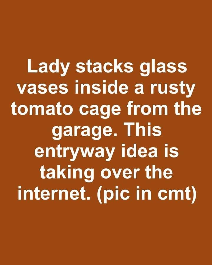 It’s not a mysterious new product or object—it’s a viral upcycled DIY décor hack using a garden tomato cage and glass vases to create a rustic entryway display.