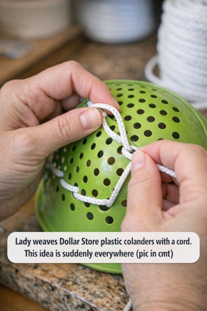 That sounds like one of those DIY upcycle trends you see on social media — people taking inexpensive plastic colanders (like from a dollar store) and weaving or macramé‑style wrapping them with cord to turn them into stylish and functional items.
