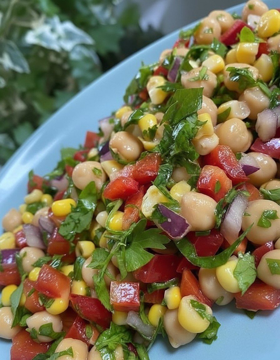 In a large bowl, add chickpeas, vegetables, and parsley/cilantro.