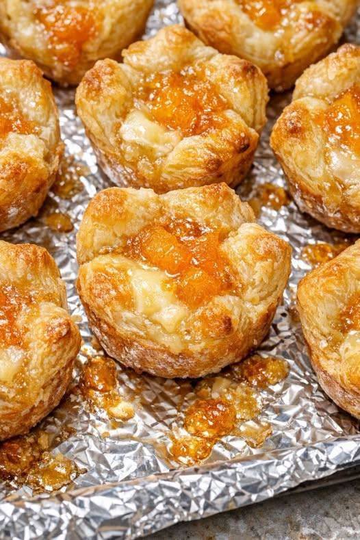 Flaky frozen puff pastry filled or topped with melted brie and sweet fruit preserves, baked until golden.