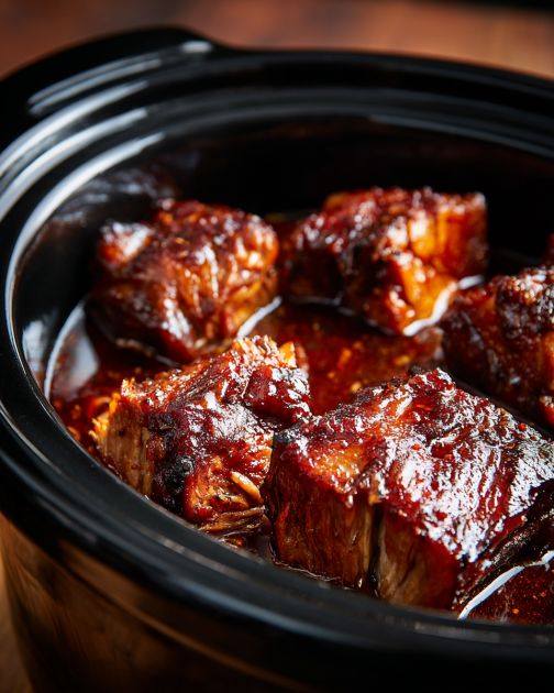 Cover and cook on low for 6–8 hours or high for 3–4 hours until ribs are tender and easily pull apart.